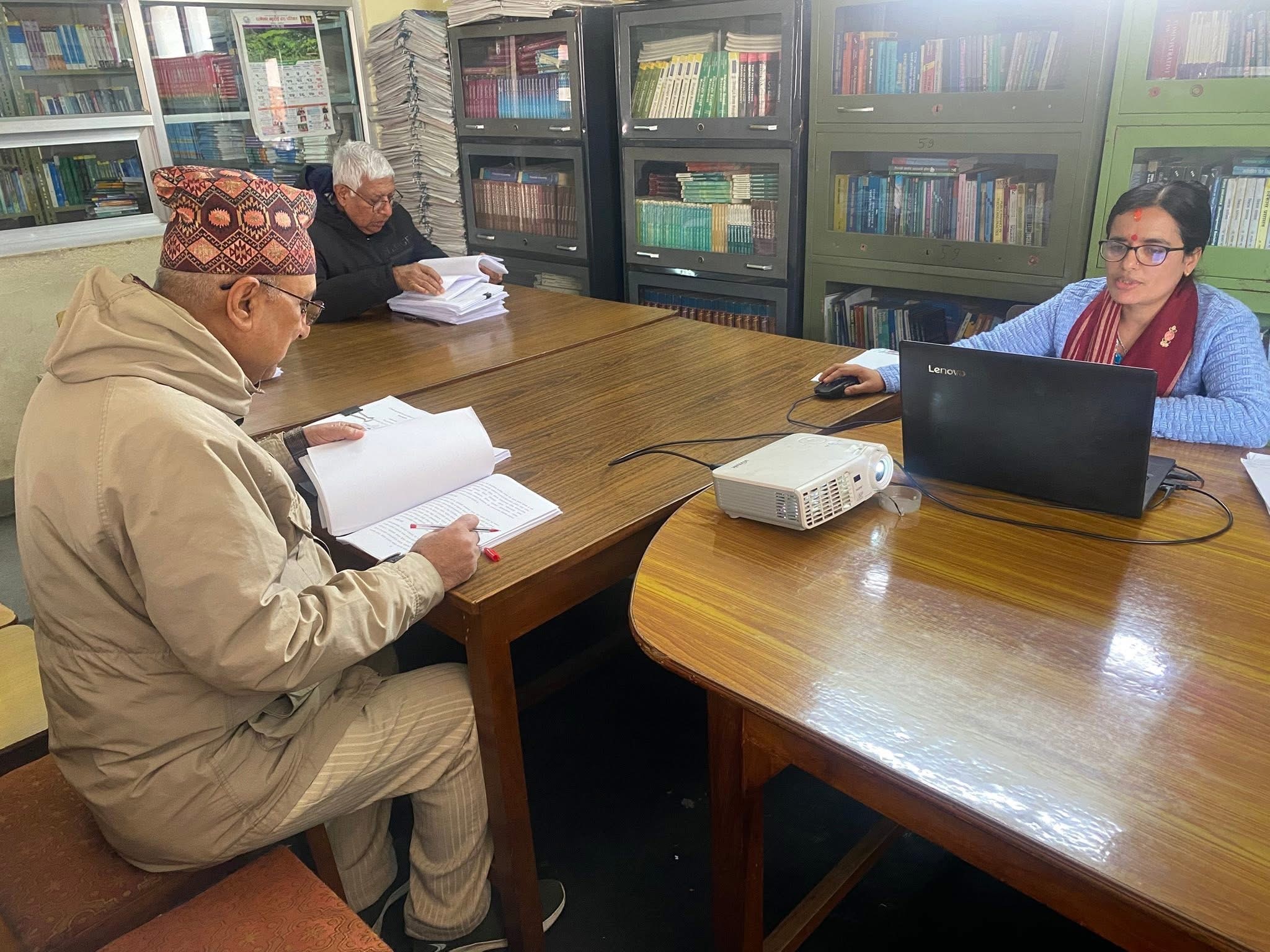 आज मिती २०८२-९-७ गते प्रा.डा. पुरूषोत्तम शमा॔ज्यूको अध्यक्षतामा बाह्य बिज्ञ पूवांञ्चल विश्व बिधालयका पूव॔ उपकुलपति प्रा.डा. यादव राज कोईरालाज्यू आन्तरिक बिज्ञहरु प्रा. रत्नराज निरौलाज्यू, प्रा. डा. राजीव बिक्रम राणाज्यू , र श्री चेतना थापाज्यूबाट बिधाथी॔हरु यमुना अया॔ल , बिनायक शमा॔, दुगा॔ गाहा, बबिता बिष्ट, लोक कुमारी तिमिल्सीना, श्याम प्रसाद यादव र राम बहादुर खत्रीले तयार गरेको शोधपत्रको मूल्याकन सम्पन्न भयो ।